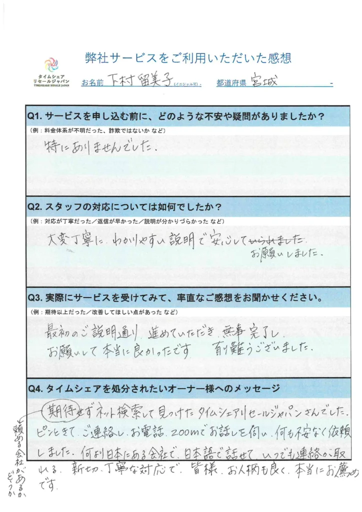 お問い合わせいただく皆様っから、タイムシェアのリセール業者の中で唯一電話で相談できた、とのお声を頂戴します。